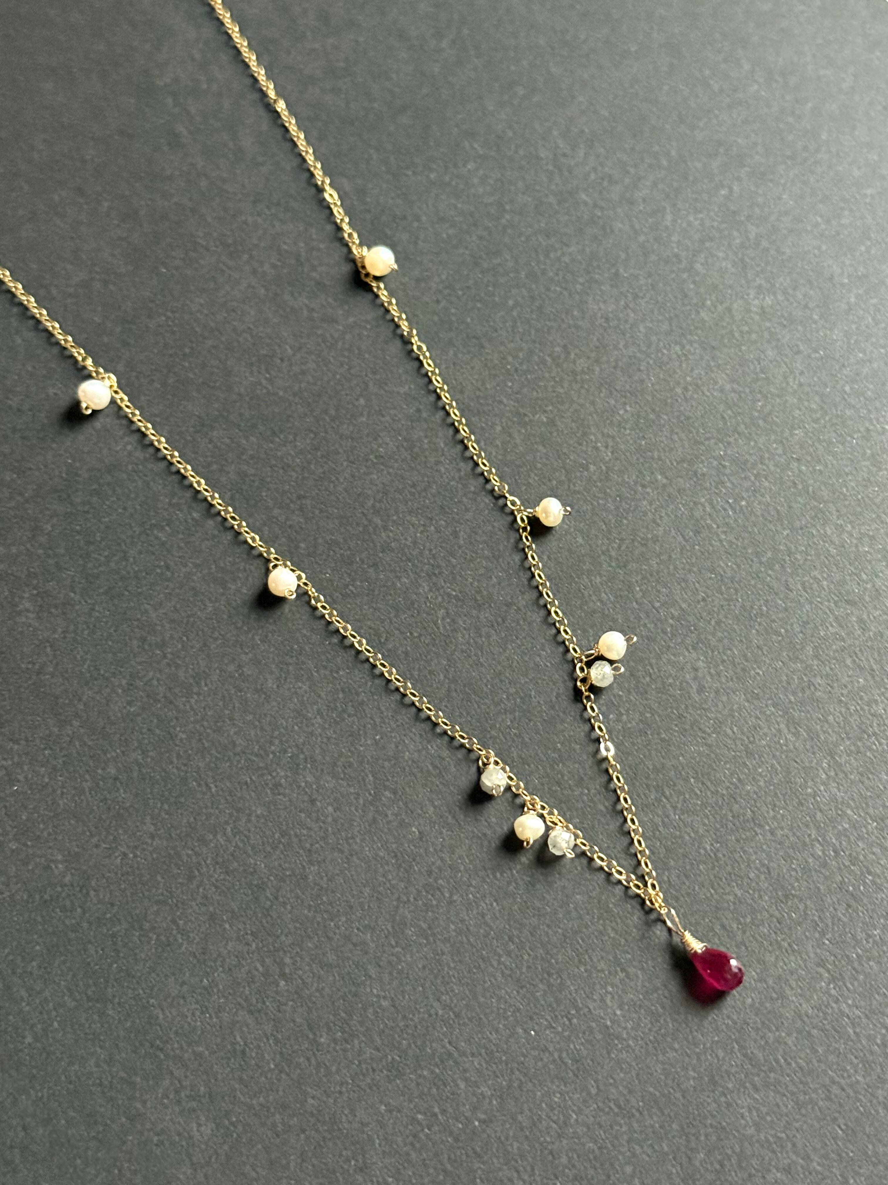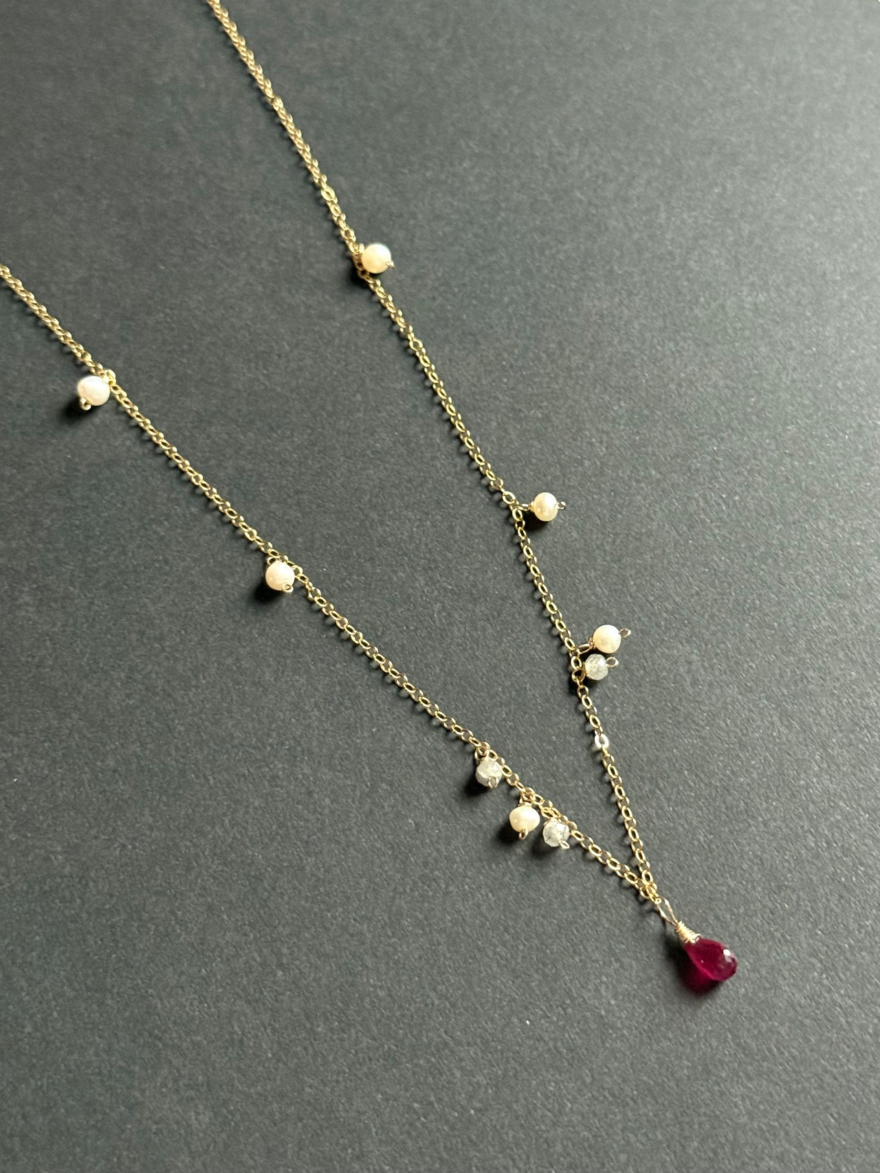 深い赤色が美しい上質なルビーを主役に、細やかなラブラドライトと淡水パールをアシンメトリーに添えた、シンプルながらも存在感のあるネックレス。