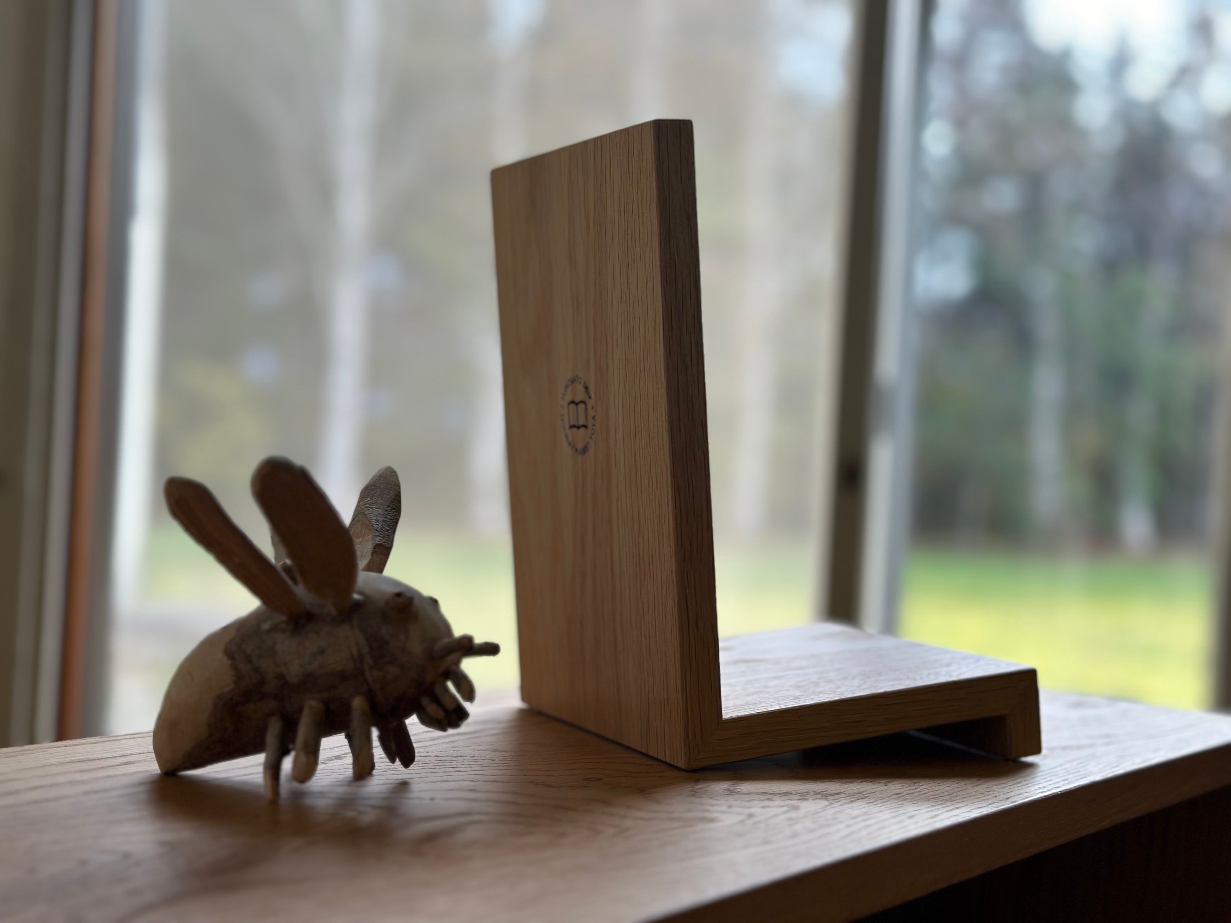 絶妙な傾斜とバランスで成り立つ、湯ノ里デスクの自立式本立て。
